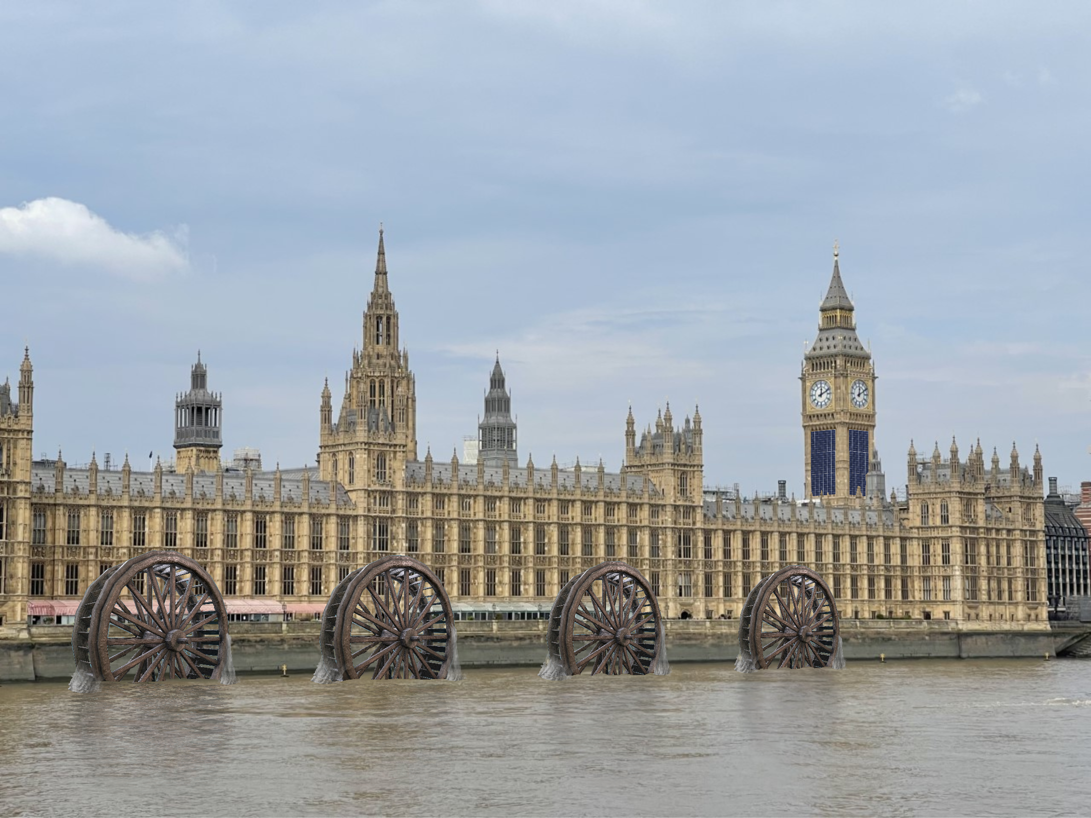 Four water wheels have been installed on the side of The Palace of Westminster, also known as the Houses of Parliament. The gigantic water wheels generate hydro electricity from the River Thames. The energy generated powers the whole building, including electric car charging points for the MPs. The Big Ben Solar Panels can be seen in the background.