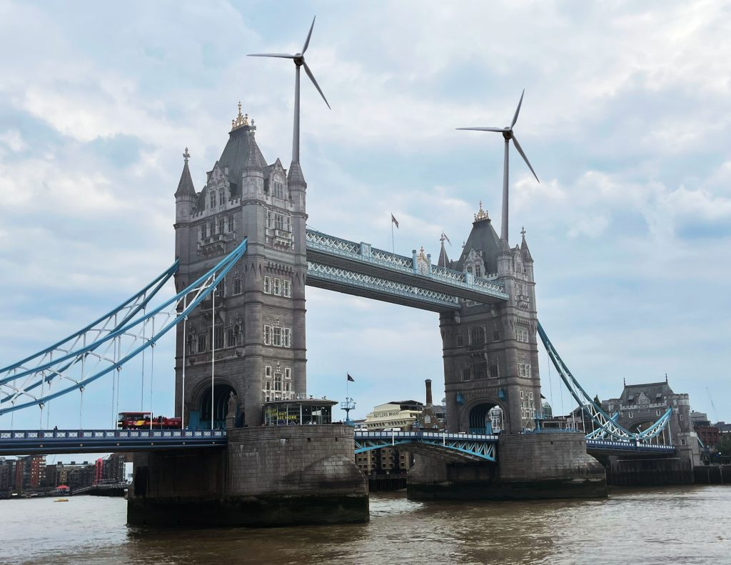 The iconic Tower Bridge had a wind turbine installed on top of each tower. The power generated is used to raise and lower the bridge with the surplus renewable energy used by the nearby Tower of London.