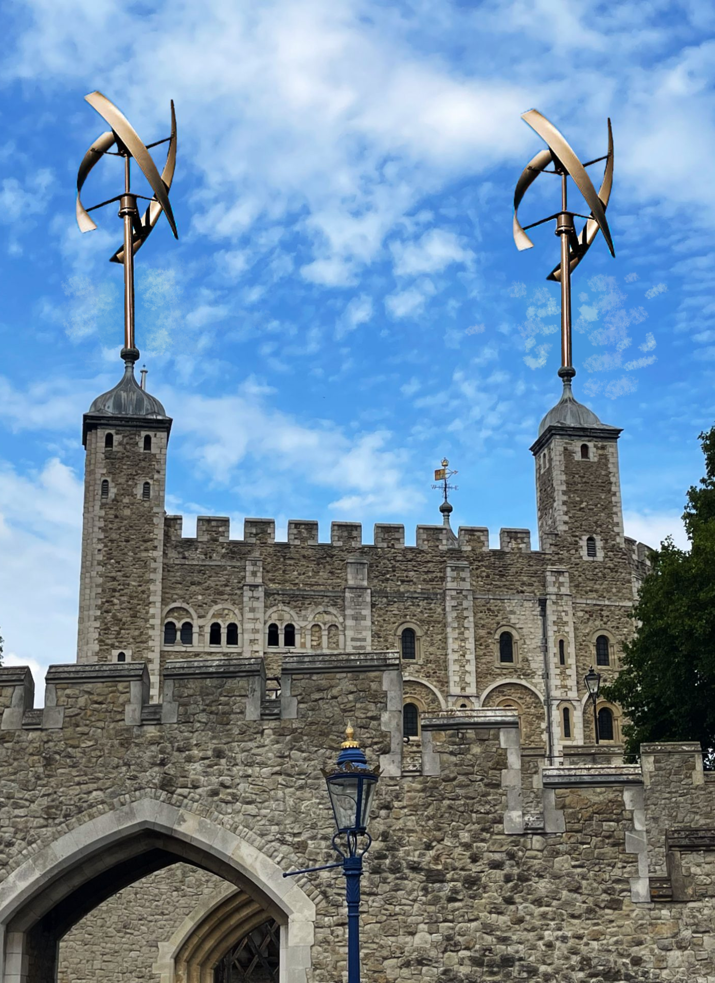 Two vertical wind turbines were installed at the Tower of London to promote Sustainable Revolution. The wind turbines complement the two remaining historic weather vanes which remain in place and working. This is another example of Old meets New sustainability within EXPO 2030.